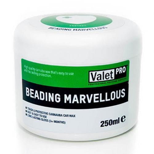 Valet Pro Beading Marvellous 250ml is a hard carnauba car wax. It adds a micro protective film, which is made from carnauba and fortified polymer waxes.
